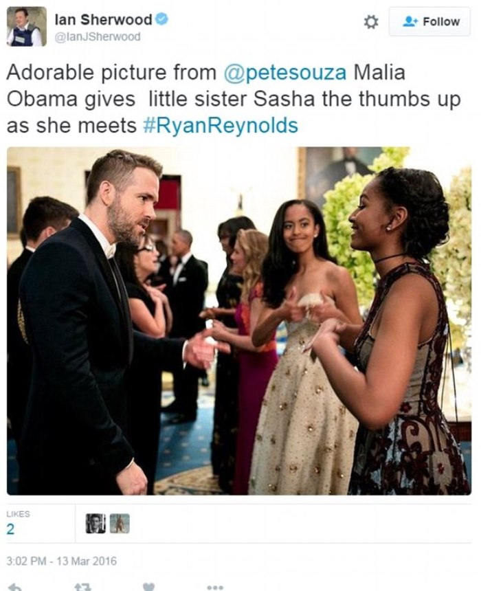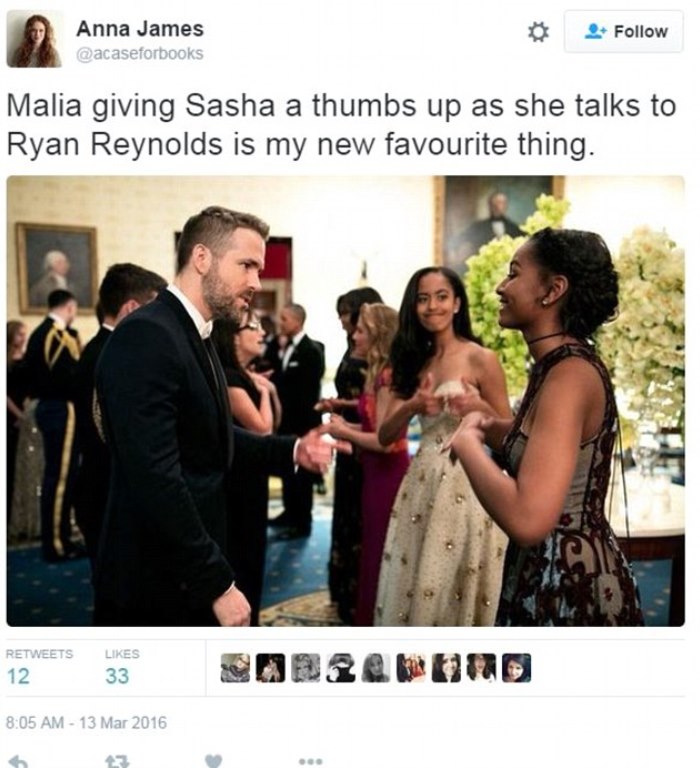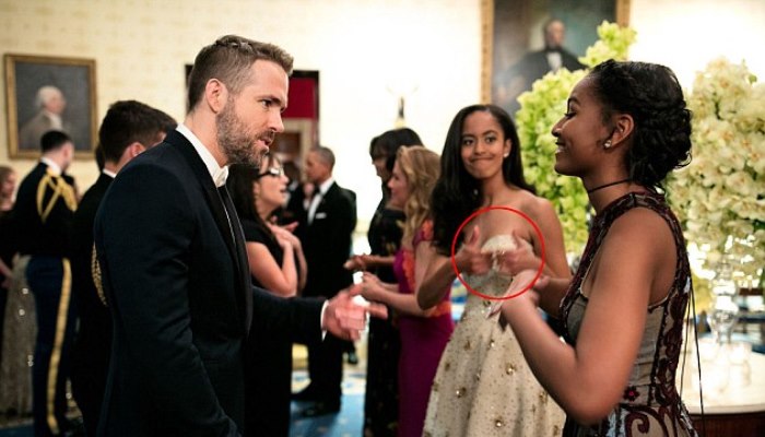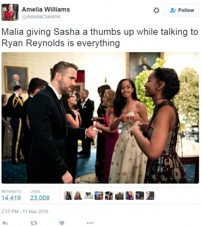国宴上,萨莎·奥巴马(Sasha Obama)见到瑞恩·雷诺兹(Ryan Reynolds)时,玛利亚·奥巴马(Malia Obama)冲妹妹半开玩笑地竖起了大拇指,这一幕被人拍下。