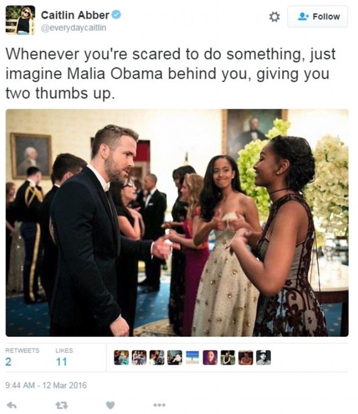 “只要你感到害怕,那么就想象一下玛利亚·奥巴马在你身后,为你竖起两个大拇指。”记者Caitlin Abber这样写道。