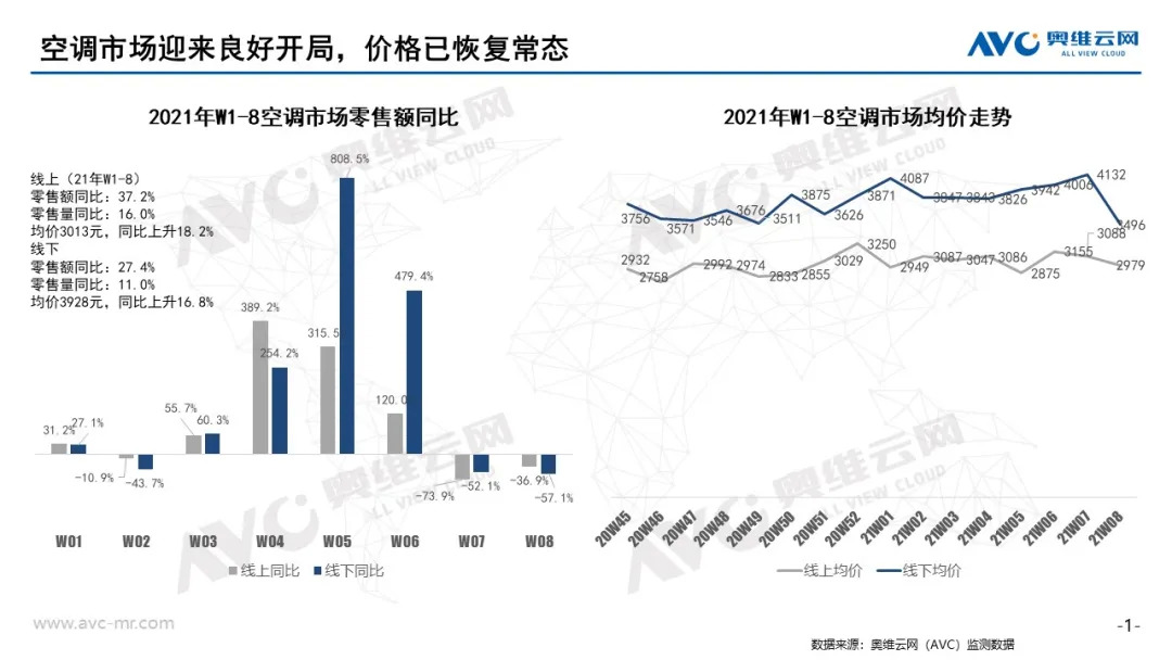 回顾2020年,空调行业因疫情下遭受了严重的打击,因空调具有安装属性,在去年一季度疫情爆发时,相对白电其他品类受到更严重的打击。且去年“凉夏”影响及促销季不旺等原因,2020年整体一年表现不如预期。从2021年开年表现来看,在经历1月完美开局后,在第7、第8周(2月8日-21日)同比出现大幅下降,主要原因为在春节期间安装不便。且各厂商及渠道商去库存压力增大,对于新的一年各大空调厂商及渠道商均面临不小挑战。