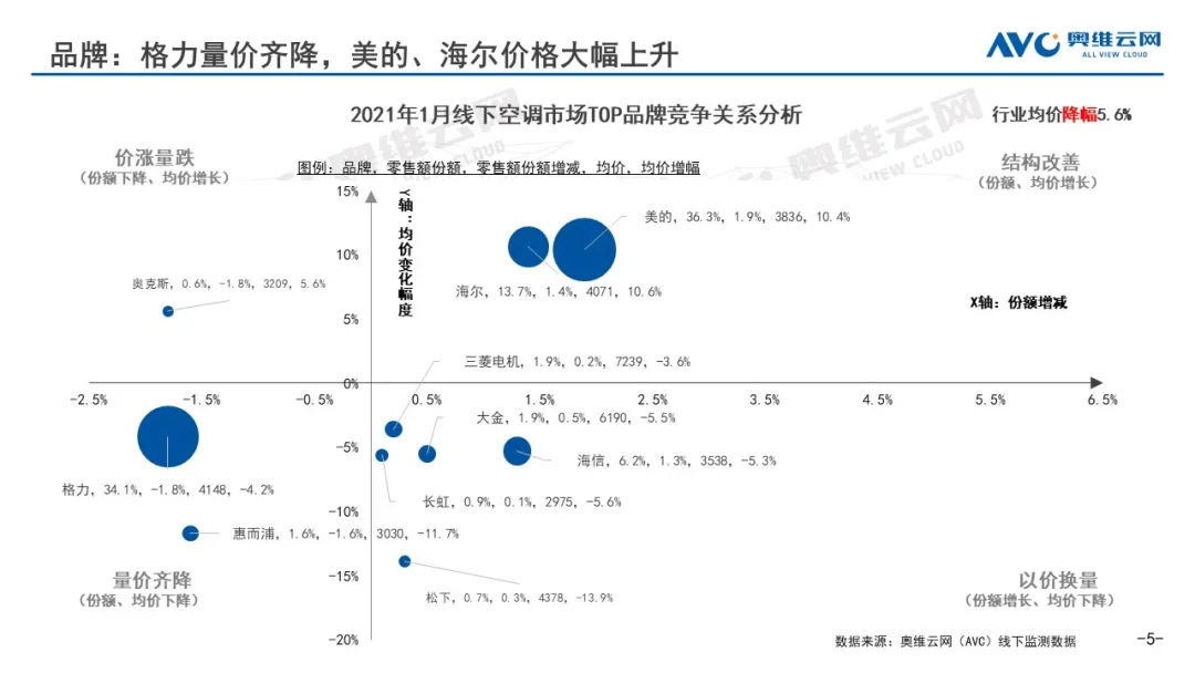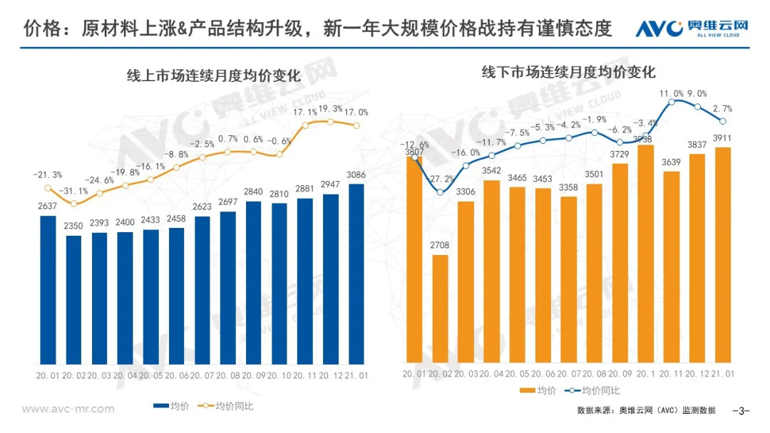 2019年“双十一”部分头部品牌发动价格战,从战略角度和企业发展来看,价格战对于龙头企业来说各有利弊。部分头部品牌在当时面临较大的库存压力,且市场需求不旺,继而发动价格战,但是战争是要付出代价的,紧接着20年1月遭遇疫情,美的、海尔等品牌面对低迷的市场环境及渠道变更不得不进行降价抢占市场。到2020年三季度,随着库存压力在减少、原材料价格上升、消费需求回暖及海外市场的火爆,各品牌价格也渐渐升高。至于今年还会不会打起价格战,将和未来3、4、5月份的市场需求以及原材料价格有密切关联,从目前趋势来看,2021年开年市场表现较好,但是随着原材料价格上涨及健康、智能类产品推广等原因,企业经营压力持续存在,且头部品牌今年策略是价格竞争向价值竞争转变,对大规模价格战持有谨慎态度。