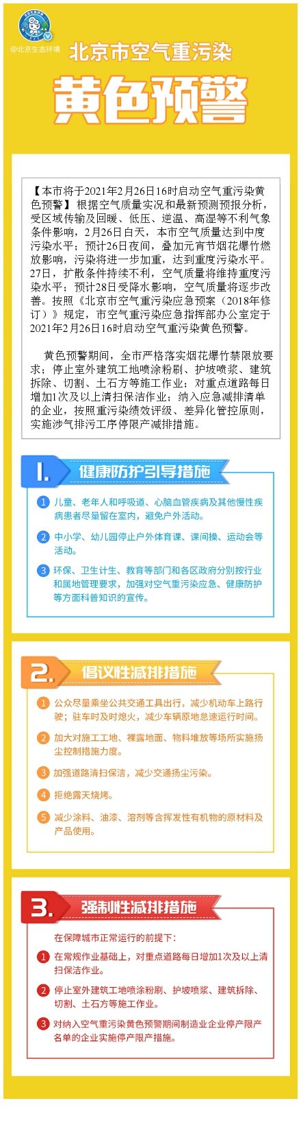 2月26日,@北京生态环境 微博消息,北京市将于2021年2月26日16时启动空气重污染黄色预警。2月26日白天,北京市空气质量达到中度污染水平;预计26日夜间,叠加元宵节烟花爆竹燃放影响,污染将进一步加重,达到重度污染水平。27日,扩散条件持续不利,空气质量将维持重度污染水平;预计28日受降水影响,空气质量将逐步改善。按照《北京市空气重污染应急预案(2018年修订)》规定,北京市空气重污染应急指挥部办公室定于2021年2月26日16时启动空气重污染黄色预警。