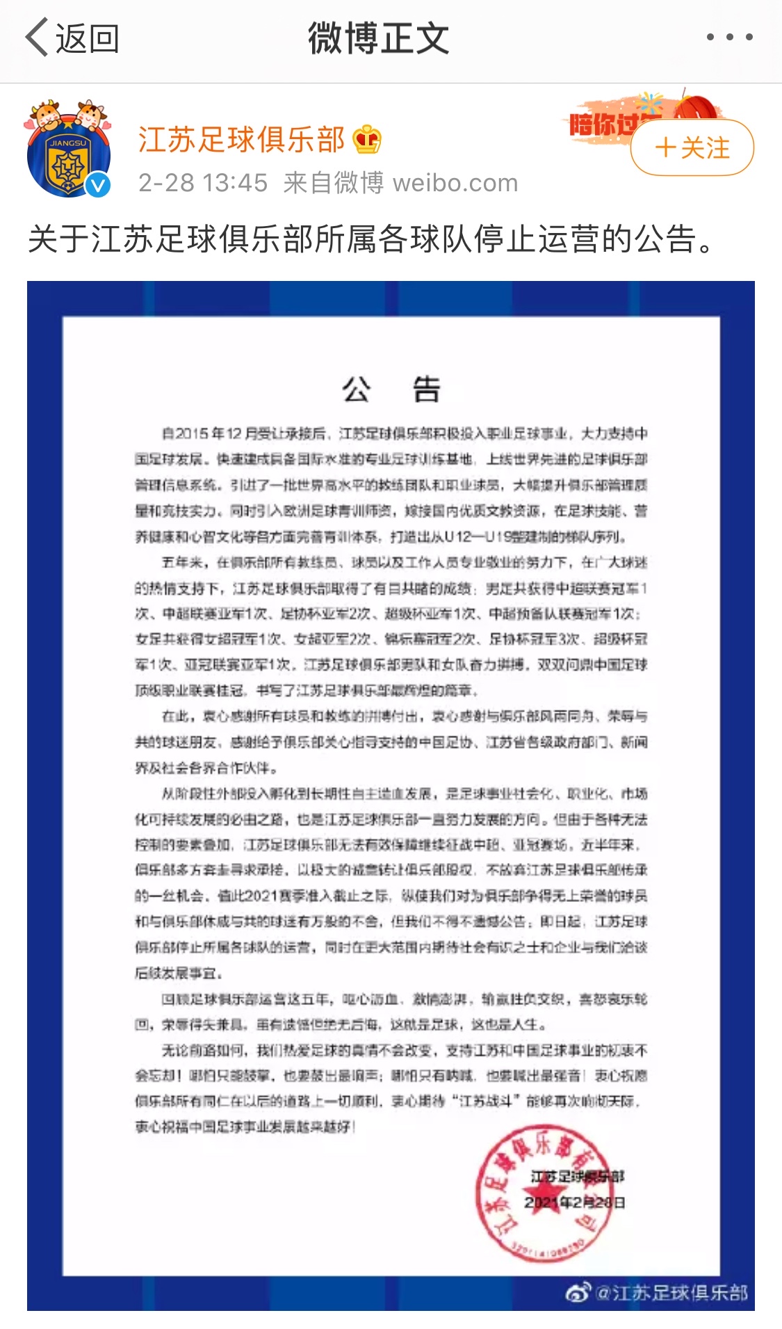 2021年2月28日下午,江苏足球俱乐部通过官微发布公告:即日起,江苏足球俱乐部停止所属各球队的运营,同时在更大范围内期待社会有识之士和企业与我们洽谈后续发展事宜。