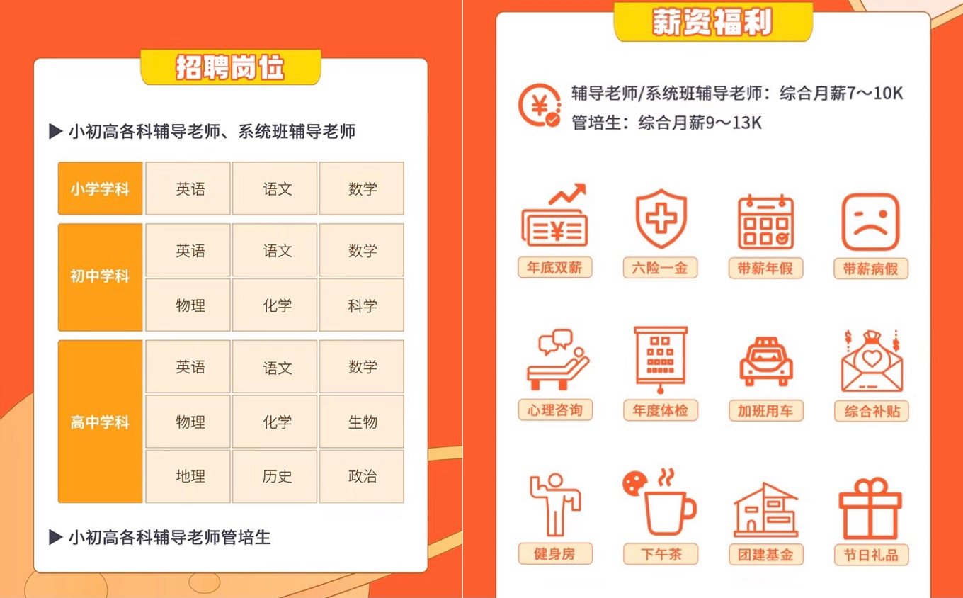 薪资待遇方面,跟谁学高途课堂开出7000-20000元/月的高薪,猿辅导的辅导老师薪资也在7000-10000元/月。作业帮在本次春季正式招聘中虽没有明确注明薪资金额,但根据其春招提前批中的说明,辅导老师岗位的综合年薪为8-15万元。