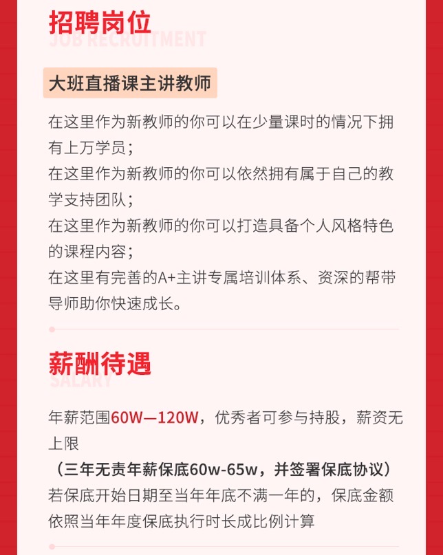 高途课堂是跟谁学今年主推的旗下品牌,去年12月,就已宣布高途课堂启动高途A+2021春招提前批招聘工作。此次招聘大班直播课主讲老师,年薪在60-120万元之间,并可享受三年无责底薪,保底60-65万元。