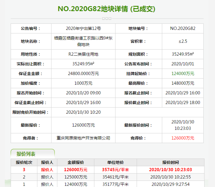 该盘系南京土拍新政后的“双限”地块,2020年10月30日3轮竞拍后,由东原以总价12.6亿斩获,成交楼面价14298元/㎡,毛坯房销售限价24500元/㎡。