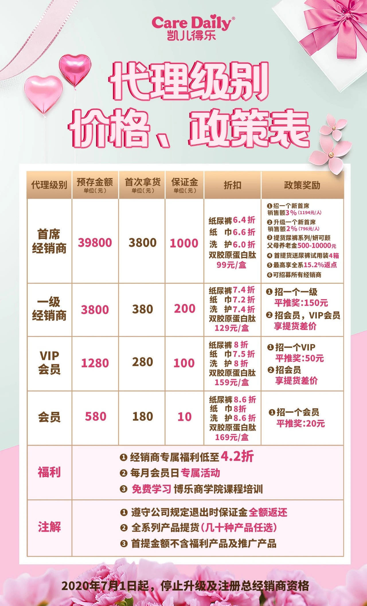 事实上,这也是凯儿得乐多次调整代理政策的结果。在2020年7月之前,它的代理分为首席经销商、总经销商、一级经销商、VIP会员、会员5个层级;在2020年7月之后逐步取消了总经销商和VIP会员2个级别。
