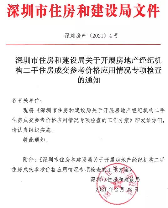 《通知》表示,深圳住建局将开展中介二手房成交参考价应用情况的检查,而文件下发的时间为2月23日。