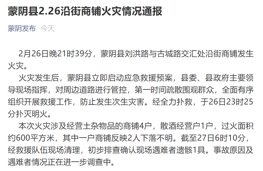 本次火灾涉及经营土杂物品的商铺4户,散酒经营户1户,过火面积约600平方米,其中一户商铺反映2人下落不明。截至27日6时10分,经救援队伍现场清理,初步排查确认现场遇难者遗骸1具。事故原因及遇难者情况正在进一步调查中。