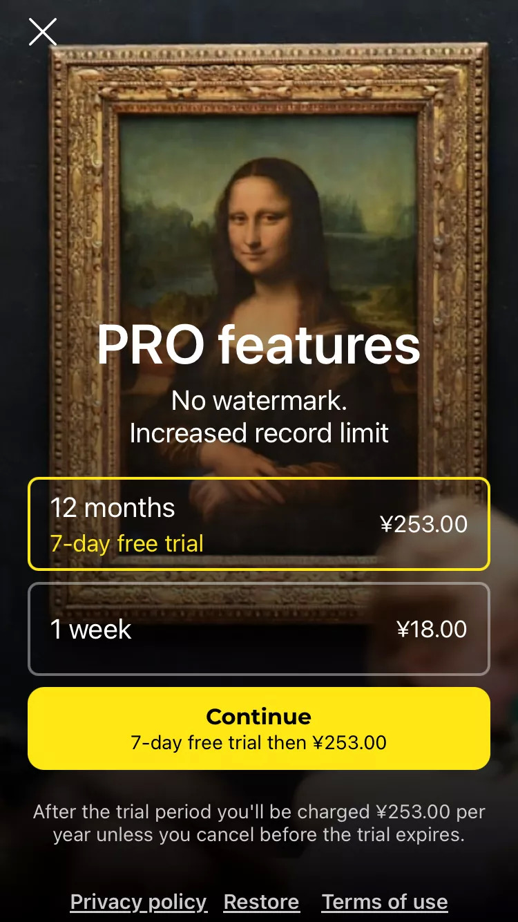 从目前能够看到的信息来看,Avatarify的变现路径只有按周或按年付费。虽然下载、使用Avatarify是免费的,但用户若想在生成的GIF及视频中去除水印、增加内存则需要付费,一周人民币18元,包年价格为253元(有7天免费试用期)。有多少用户愿意为了这一功能付费还需要打上一个问号。