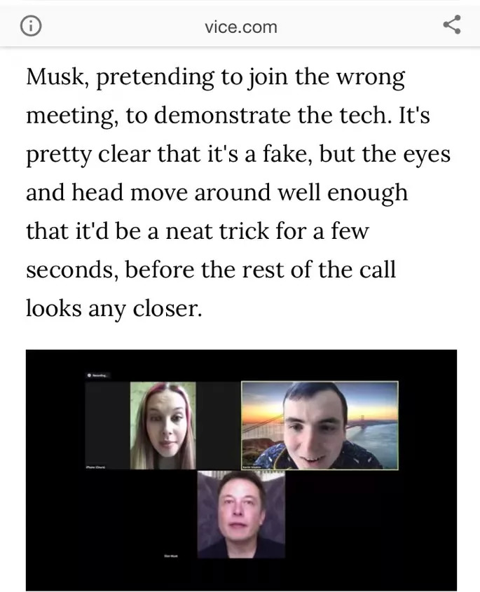 在和同事的视频通话中,Ali Aliev用Avatarify软件把自己的头像换成了特斯拉创始人马斯克,假装进错了会议室。这则恶搞视频发布到YouTube网站后,受到网友们热捧。后来这位程序员开发了这款变脸应用并将其开源(分享在Github上公开使用),后来有了Avatarify的APP版本。