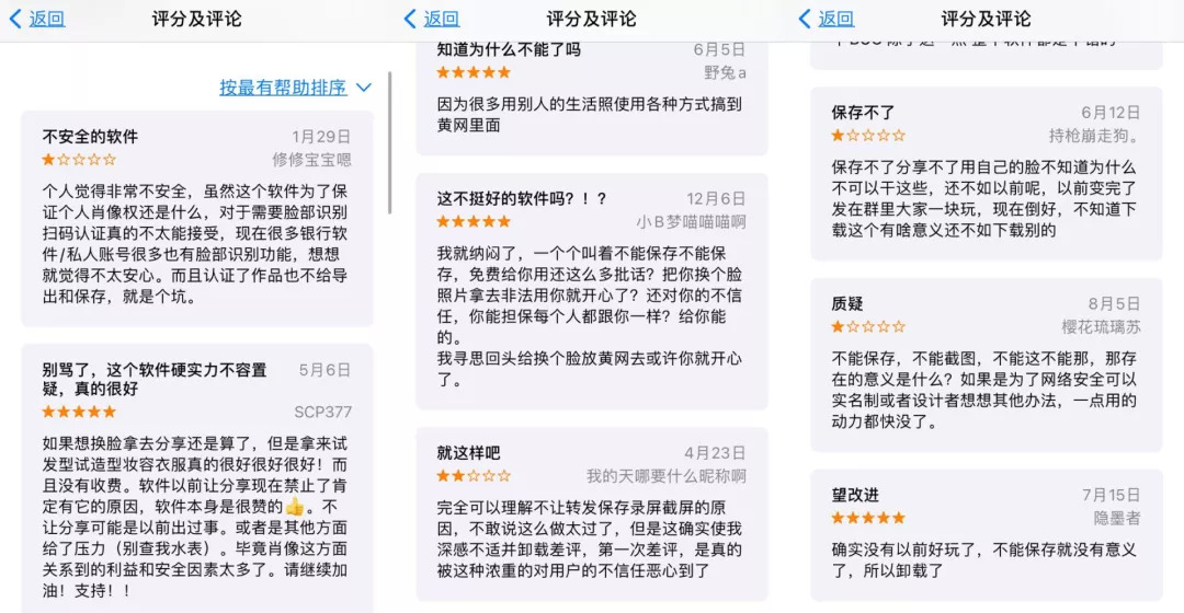 三天之内,ZAO在APP Store评分从4.6分暴跌至1.9分。当年9月3日,针对ZAO用户隐私协议不规范,存在数据泄露风险等网络数据安全问题,工信部对ZAO运营方进行了约谈。ZAO在苹果APP Store下的评论显示,如今ZAO已转型为试穿明星同款服装、穿搭的软件,但是视频不能保存、不能截屏、不能分享。有的用户因此直接卸载了软件。判官表示,对于换脸软件而言,隐私、安全方面的风险将会如影随形。
