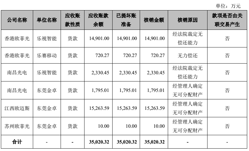 1月22日,欧菲光披露,旗下子公司拟对经法院裁定无偿还能力、无法收回、经管理人确定无可分配财产的应收账款共计3.50亿元进行核销处理。截至2020年12月31日,上述各项应收账款均已全额计提坏账准备。