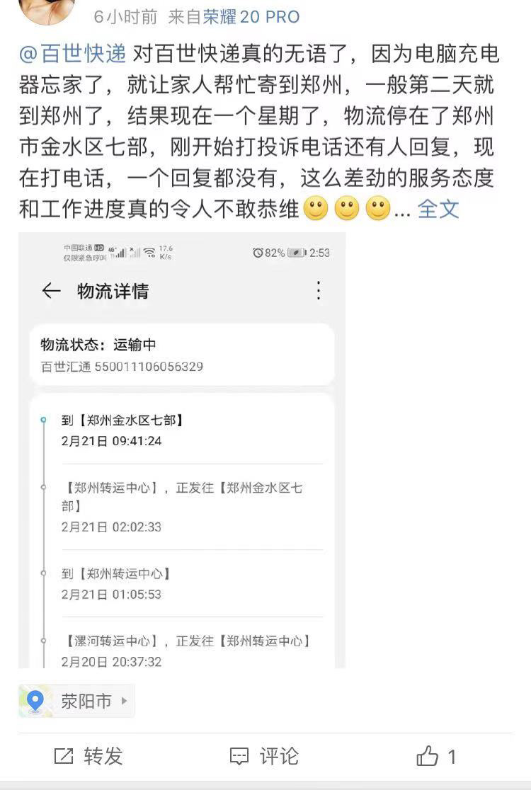 还有一位网友反映,一般寄快递第二天就能到,但是自己的百世快递一个星期了仍然没有收到,在郑州金水区七部已经停留了6天了。