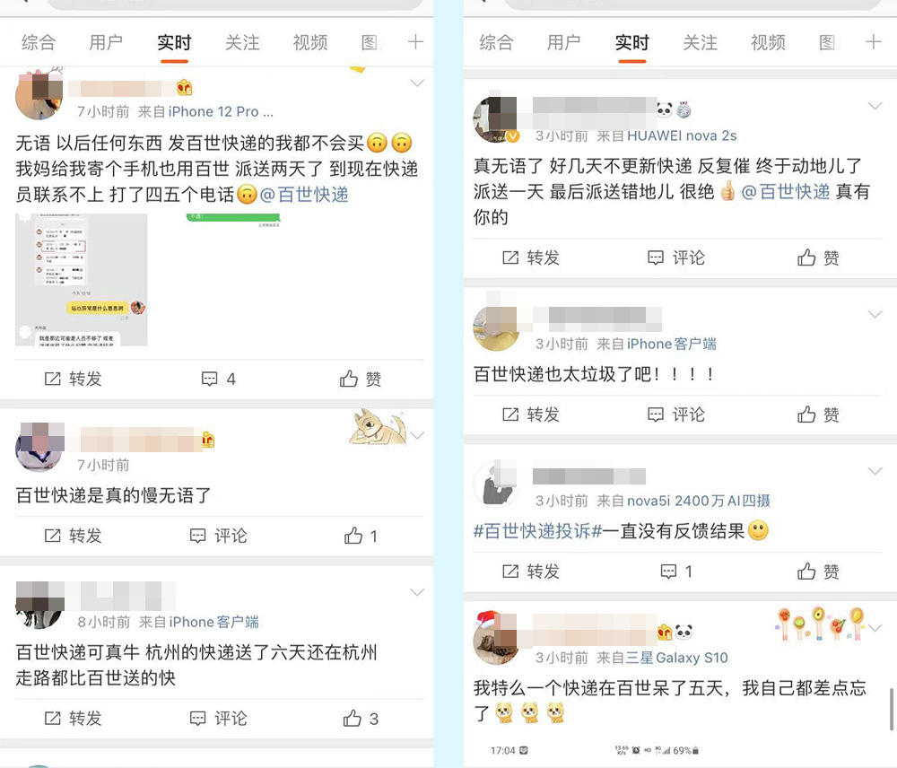 界面新闻在社交媒体上发现,不少网友反映自己的百世快递好几天不更新物流信息,快递员的电话也联系不上,一位网友反映自己的快递在杭州6天了仍在还在杭州。