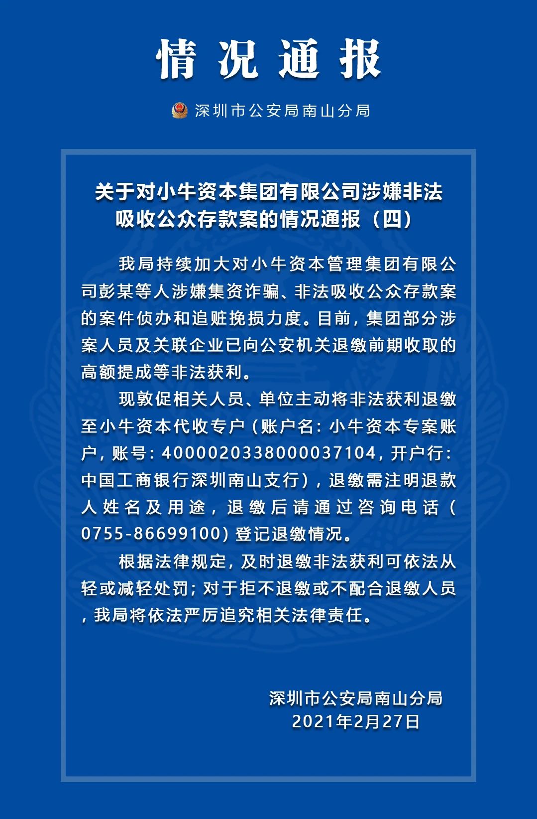 2月27日,深圳南山公安通过官方微信公众号发布关于对小牛资本集团有限公司涉嫌非法吸收公众存款案的情况通报(四)。目前,小牛资本部分涉案人员及关联企业已向公安机关退缴前期收取的高额提成等非法获利。