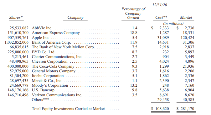 根据美国公认会计准则(GAAP),伯克希尔·哈撒韦2020年全年盈利为425亿美元,较去年减少48%,其中包括219亿美元的经营利润,49亿美元的已实现资本利得,持有股票净未实现资本利得增加所带来的267亿美元收益,子公司和附属公司的价值减记导致的110亿美元损失。