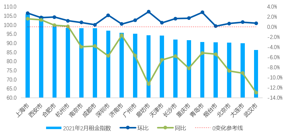 从租金水平来看, 2021年2月重点城市平均月租金为42.1元/平米,平均租金指数环比上涨1.5%,同比下降5.0%。