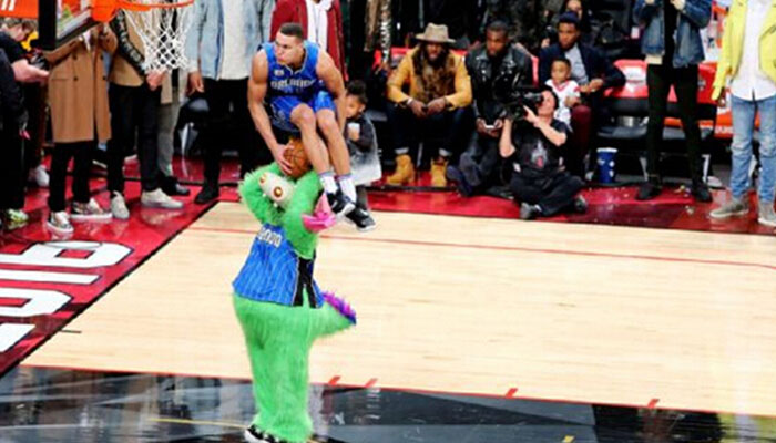 那天是2月9日,距离他去多伦多参加扣篮大赛还有三天时间。在尝试了12次之后,戈登终于完成了自己准备的最难的一个扣篮:跳过魔术队的吉祥物,抓住吉祥物头顶上的篮球,然后把球放在他的两条腿下面,最后用自己的非惯用手(他的左手)完成扣篮。