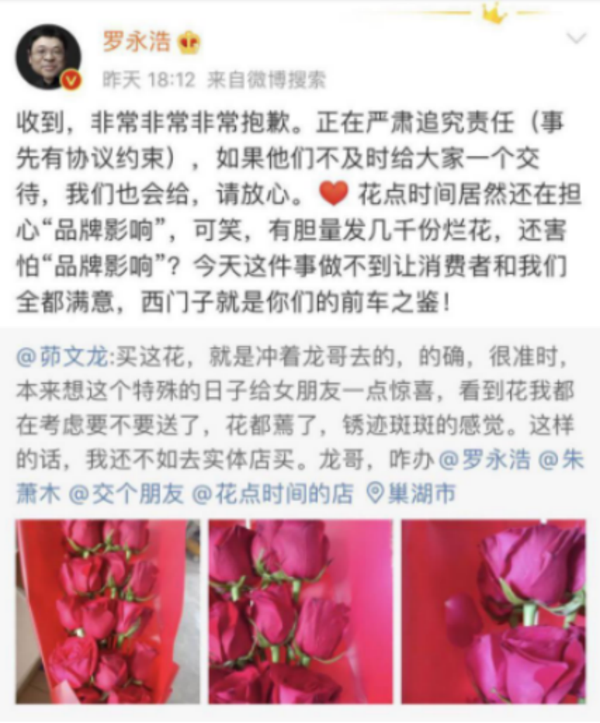 “今天这件事做不到让消费者和我们全部满意,西门子就是你们的前车之鉴。”罗永浩如此严肃讨伐的对象就是花点时间。