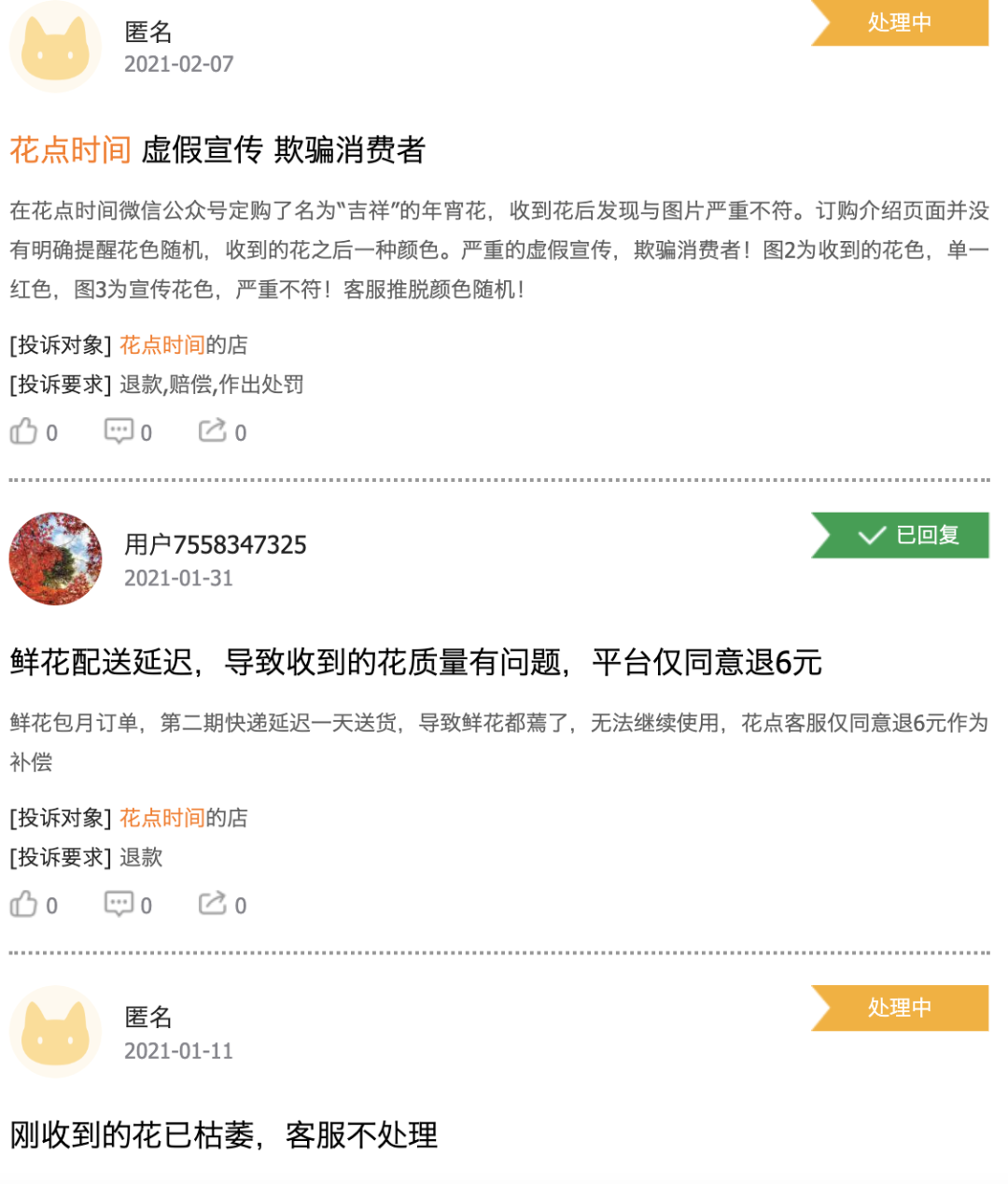 花点时间不是个例,在黑猫投诉上,关于鲜花电商的投诉多达五千条,理由多为质量受损和未按要求发货。