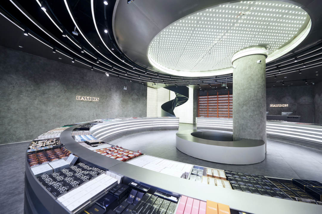 HAYDON黑洞武汉门店一楼的大椭圆开放陈列货架