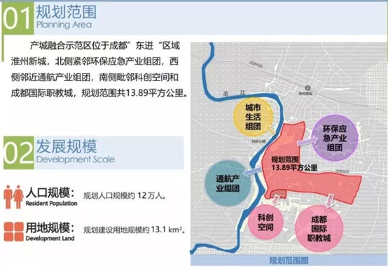 草案中提到,产城融合示范区淮州新城,北侧紧邻环保应急产业组团,西侧邻近通航产业组团,南侧毗邻科创空间和成都国际职教城,规划范围共13.89平方公里,包含建设用地规模13.1KM2,规划人口约12万人。