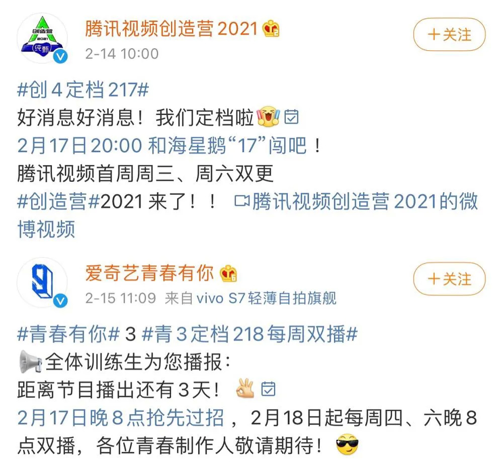 2月14日,《创造营2021》官宣定档2月17日。2月15日,《青春有你3》随即宣布2月17日晚“抢先过招”,上线先导篇。而后两档节目纷纷提前上线时间,《创造营2021》提前至晚上七点更新,《青春有你3》最新一期正片更是提前至中午十二点更新。两者在播出时间上的胶着令网友笑称,“内卷永不停息”。