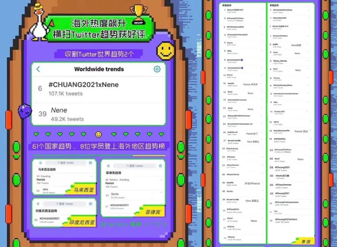 《青春有你》在第二季时便将节目视频在海外视频播放网站YouTube上进行同步,数个舞台视频观看次数超过百万。而在海外知名社交平台Twitter上,《青春有你2》的相关话题32次登上全球趋势榜,节目相关话题总共登上各国及全球趋势榜427次。《创造营2020》在播期间,在Twitter热搜榜上一共生产出了246个话题,泰国选手郑乃馨三次登上全球趋势榜。2020年,《青春有你2》《创造营2020》的出海成绩便已经有所突破。