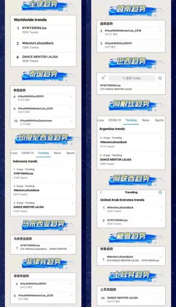 《青春有你3》先导片和第一集播出后,共获得21个包括全球趋势在内的10个国家的Twitter趋势,其中有17个话题中带有导师LISA的名字,可见其影响力。《创造营2021》则获得63个包括全球趋势在内的4个国家的Twitter趋势。《创造营2021》海外选手的初评级舞台在YouTube上也获得了不少海外网友的关注。在WeTV上,《创造营2021》运用了多语实时翻译技术,让节目能够同步翻译成英语、泰语、日语、韩语、越南语、印尼语6种语言进行播出,以服务更多的海外用户。
