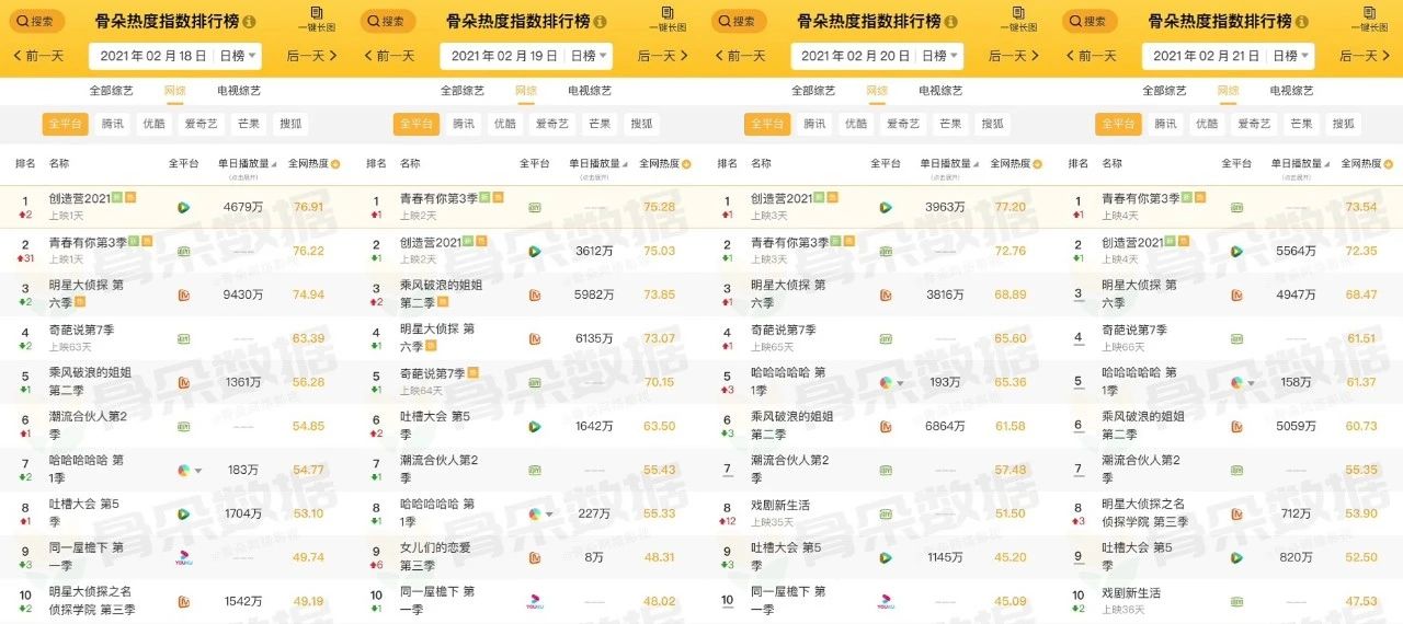 开播以来,两档节目各斩获骨朵热度指数榜日榜榜首两次,稳居榜单前四。节目热搜数据上,《青春有你3》先导片和第一期正片隔日播出,两日合计斩获微博热搜79个,《创造营2021》在2月17日晚斩获58个微博热搜。以此成绩看来,两档节目仍然是综艺节目中的流量领头羊。