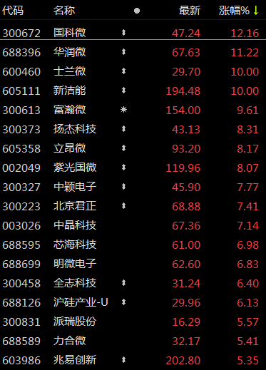 A股方面,178家半导体概念股,168只股票价格上涨。其中,士兰微(600460.SH)、新洁能(605111.SH)股价涨停;同时,国科微(300672.SZ)、华润微(688396.SH)、富瀚微(300613.SZ)、赛腾股份(603283.SH)、扬杰科技(300373.SZ)、敏芯股份(688286.SH)等30多只半导体概念股的股价涨幅在5%上。