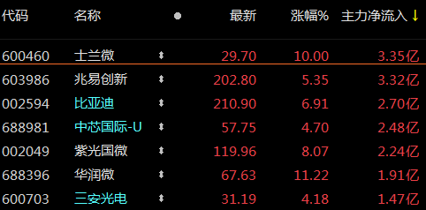 据东方财富Choice数据,截至3月1日收盘,107只芯片概念股获超33亿元主力资金“杀入”。股价涨停的士兰微当日主力资金净流入3.35亿元,科创板股价涨4.7%的中芯国际(688981.SH)主力资金净流入2.48亿元,股价涨8.07%的紫光国微当日主力资金净流入2.24亿元,股价涨11.22%的华润微主力资金净流入1.91亿元。