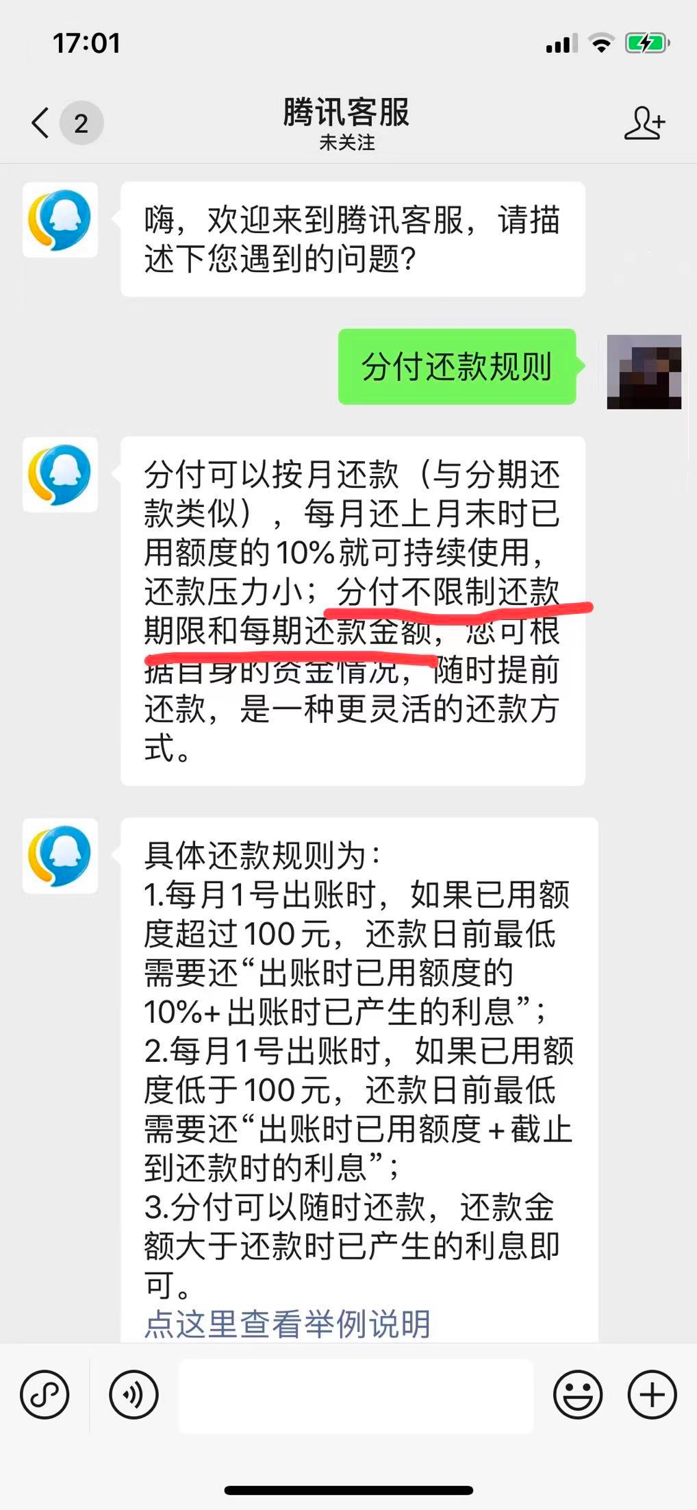 据腾讯客服介绍,分付可以按月还款(与分期还款类似),每月还上月末时已用额度的10%就可持续使用,还款压力小;分付不限制还款期限和每期还款金额,用户可根据自身的资金情况,随时提前还款,是一种更灵活的还款方式。