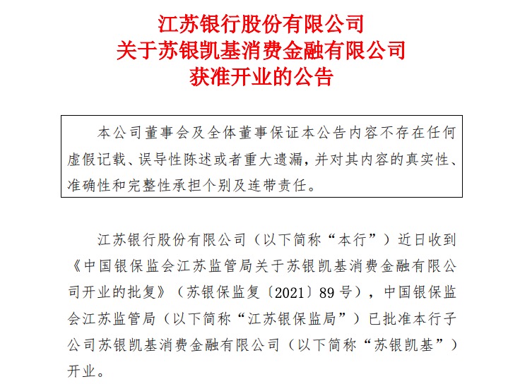 3月1日下午,江苏银行发布关于获准开业的公告指出,该行近日收到《中国银保监会江苏监管局关于苏银凯基消费金融有限公司开业的批复》(苏银保监复〔2021〕89 号),中国银保监会江苏监管局(以下简称“江苏银保监局”)已批准本行子公司苏银凯基消费金融有限公司(下称“苏银凯基消金”)开业。
