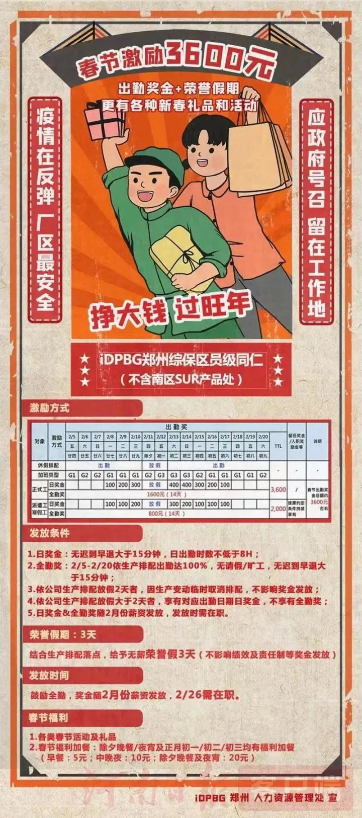 为激励员工留守加班,富士康郑州厂区开出3600元春节激励奖金。