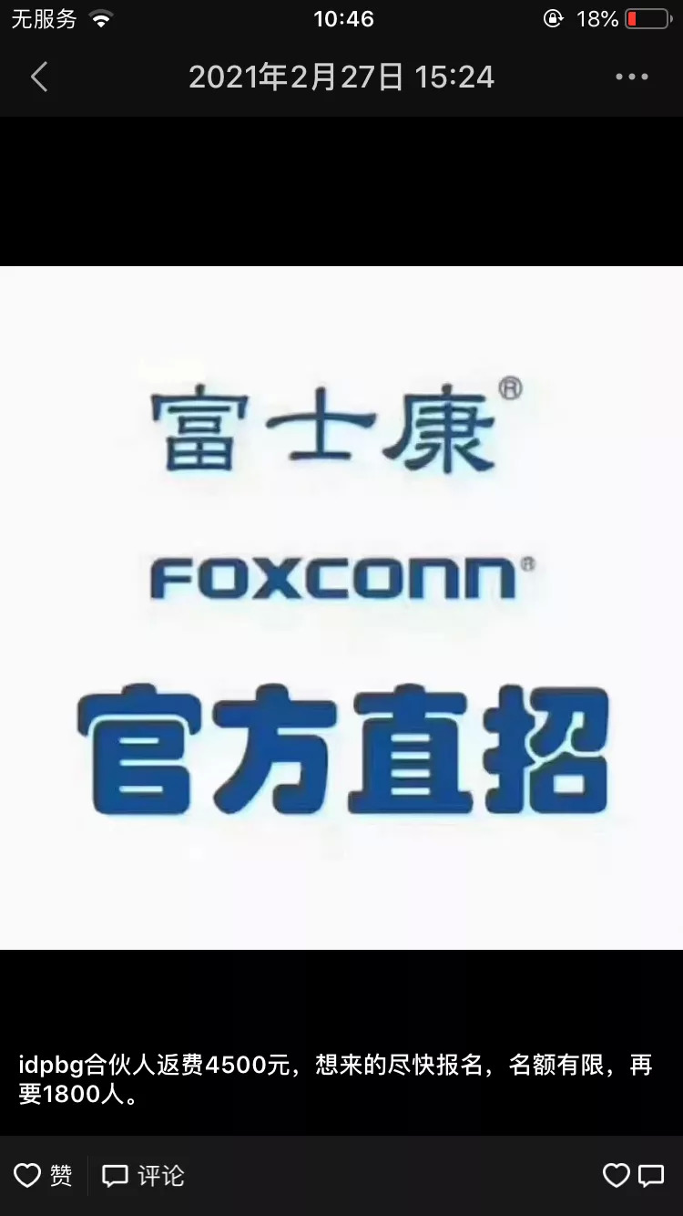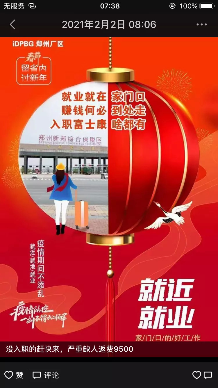 春节前,有中介发朋友圈称富士康“严重缺人”,返费9500元。