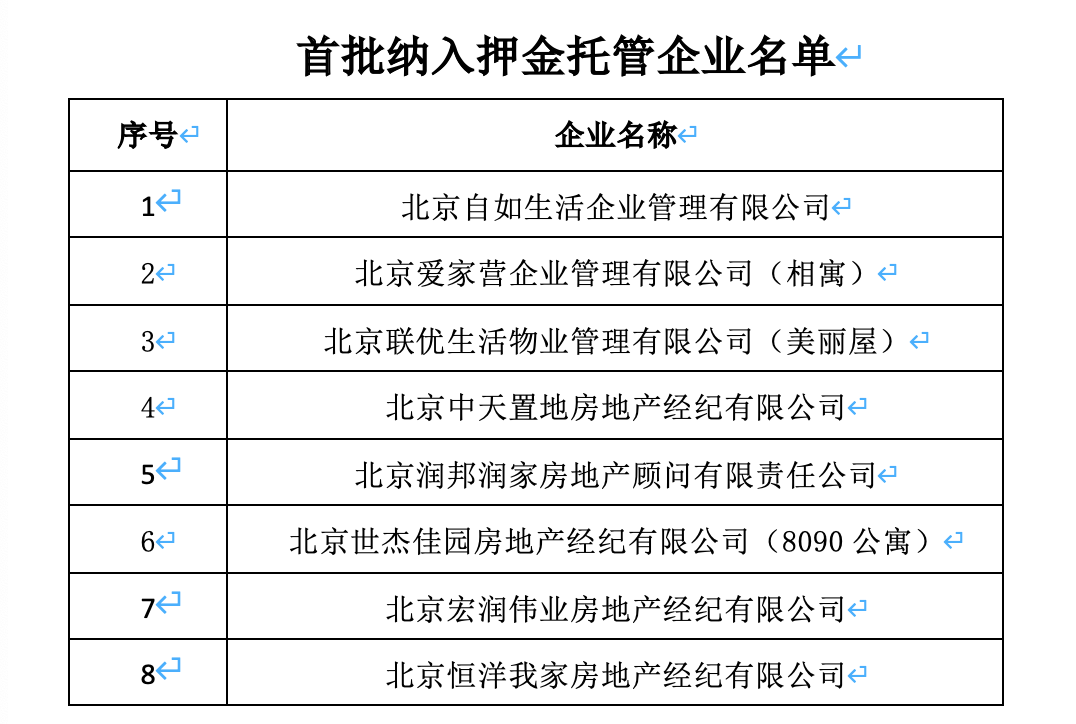 “北京房地产中介行业协会”微信公众号3月1日消息,北京房地产中介行业协会公布了8家率先纳入押金托管的企业名单。按照规定,自3月1日起,企业向承租人收取的押金应当通过北京房地产中介行业协会建立的专用账户托管,且收取的押金数额不得超过1个月租金。