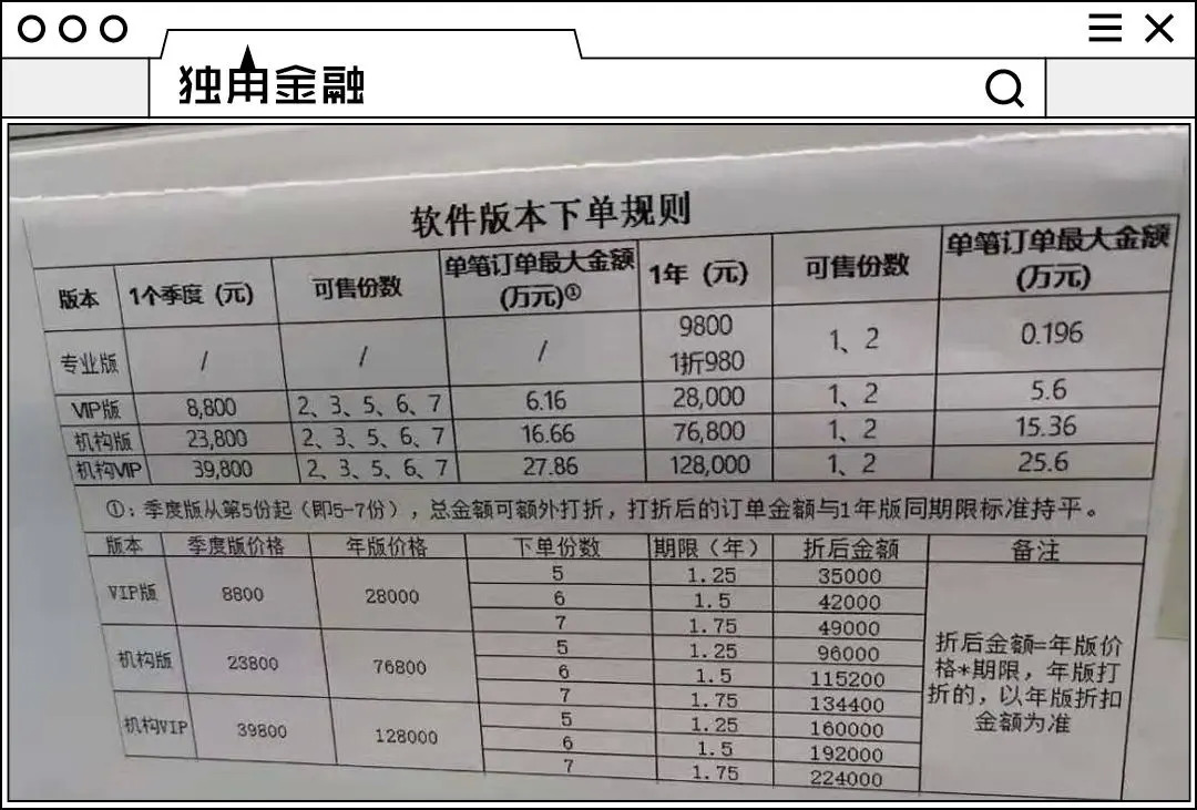 在警方披露的会员价位表中可以看到,最低一档为9800元/年,往上还有2.8万元/年、7.68万元/年、12.8万元/年等不同档位,并且根据销售额的不同,业务员能够从中拿到3%-10%的业绩提成。