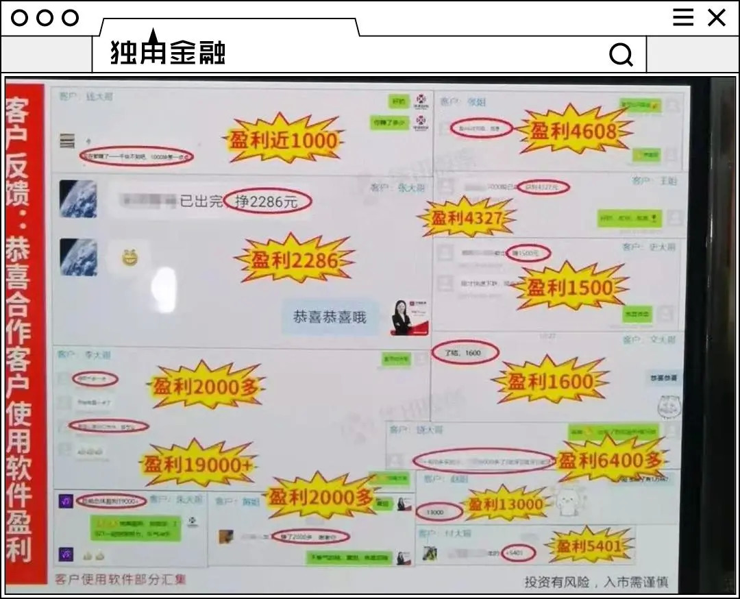 付费前,公司“名师”会在荐股群中推送集合竞价的高开股票或是近期连续涨停的股票,并且“报喜不报忧”,对上涨的股票大力吹捧,对下跌的股票绝口不谈,给入群股民造成“推荐的股票都暴涨”的假象。
