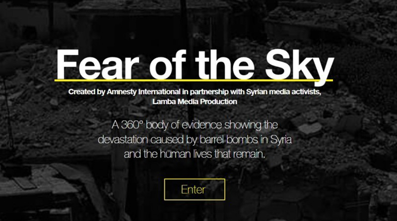 这组名为“恐惧的天空”的VR体验,使用360°摄影技术以及WebGL 3D图形和视频还原炸弹落在地面上的瞬间,甚至能听到听到子弹从拍摄虚拟现实画面的设备旁呼啸而过的声音。与此同时,还有背景解说,带你深入了解整个事件,尤其是被炸弹袭击的安萨里学校操场和阿勒颇农贸市场,场面非常残暴。