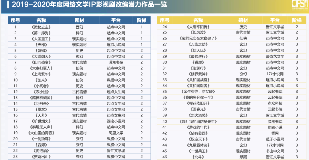 此前,由中国电影家协会指导,中国电影家协会编剧教育工作委员会与北京电影学院中国电影编剧研究院发布的《2019-2020网络文学IP影视剧改编潜力评估报告》从多个维度表明了网络文学IP的价值。如今,随着网文IP爆款剧的频出,也从终端佐证IP储备的价值体现。