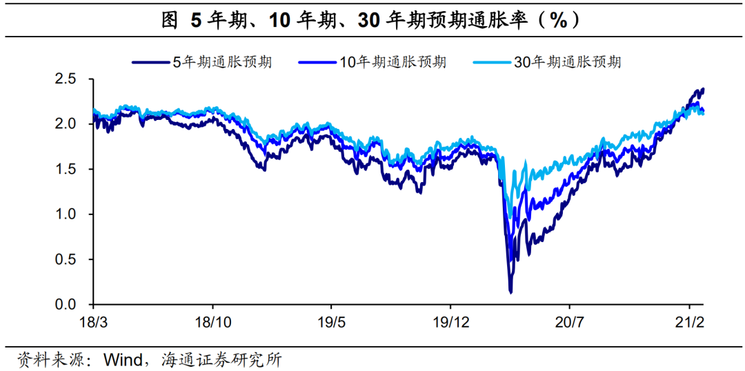 当前美国的通胀预期已经大幅提升。截止2月底,美国5年期通胀预期升至2.34%,创11年5月以来新高;10年期通胀预期升至2.14%,也创14年8月以来新高。