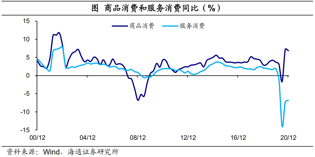 整体消费看起来弱,主要是因为服务类消费比较弱,截至2020年12月,美国服务消费依然负增6.8%,与商品消费有约14个百分点的缺口。而服务类消费弱并不是因为居民没有消费能力,主要是因为疫情防控,人口的流动和聚集还受到限制。