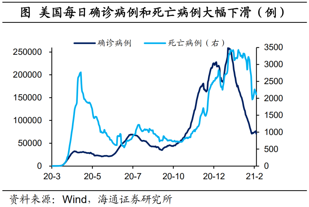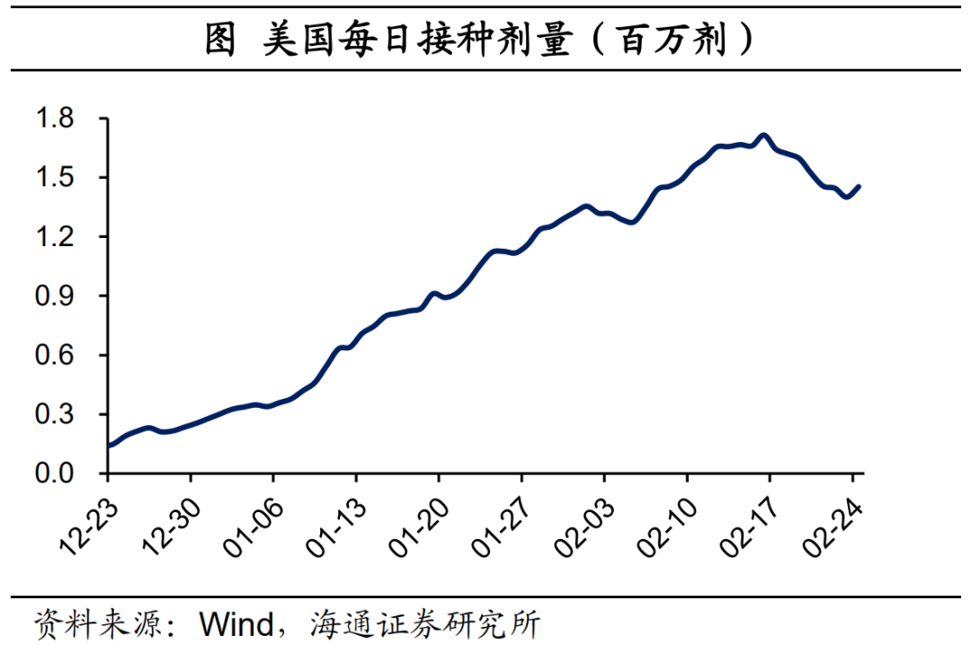 美国当前疫情已经大幅改善,每日新增病例不到8万人(七天移动平均),每日死亡病例也大幅下滑。同时,美国每日接种仍较快,截止2月24日,近一周每日接种剂量平均在150万,已经完成接种人群占比高达6.5%,领先其他主要发达经济体,仅次于以色列和塞尔维亚。往前看,随着疫情的改善,美国的经济、通胀、就业都会出现历史上最快速度的修复。