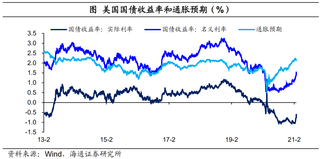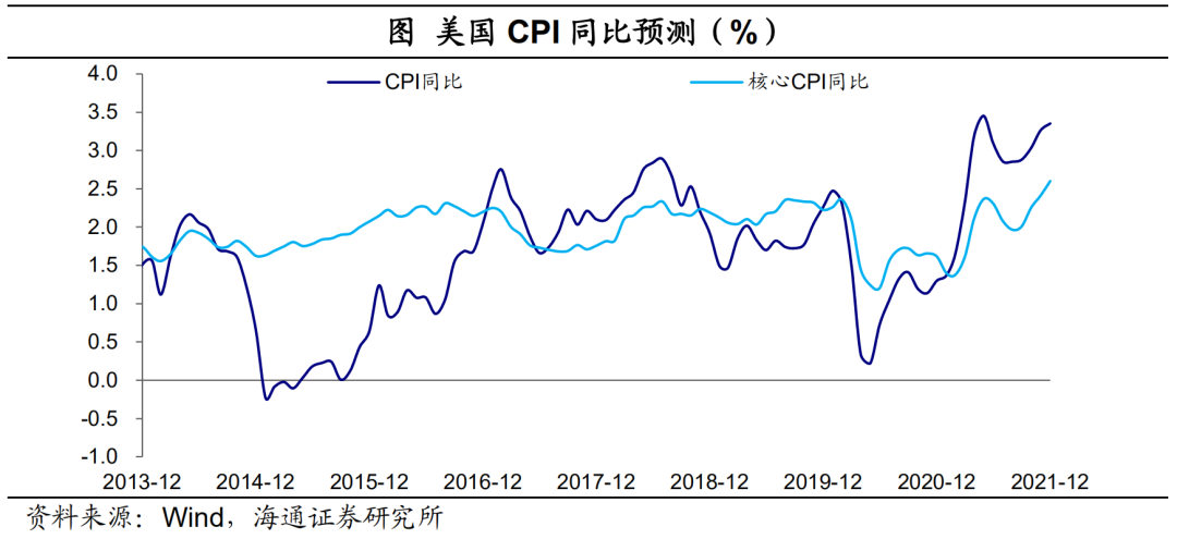 而随着美国疫苗接种加速,疫情逐步得到控制的背景下,居民消费能力又有提升,未来服务消费需求也很快会回到正常,从而带动美国整体消费、通胀中枢的上移。