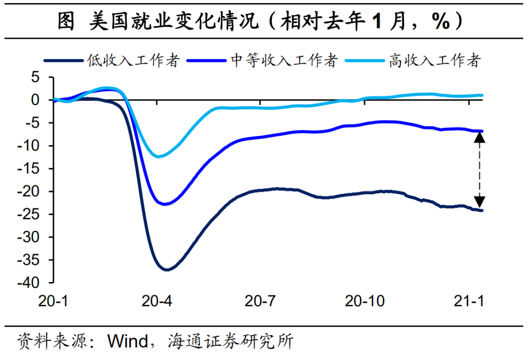 之所以就业人员的工资也大幅提高,主要是因为多数失业者为低收入从业人员,这些人员退出劳动力市场后,留下来的从业人员的平均工资提高了。美国就业跟踪数据显示,截止今年1月底,低收入工作者就业状况相比去年1月仍旧下滑24.2%,而高收入工作者早在去年10月就已经转正。
