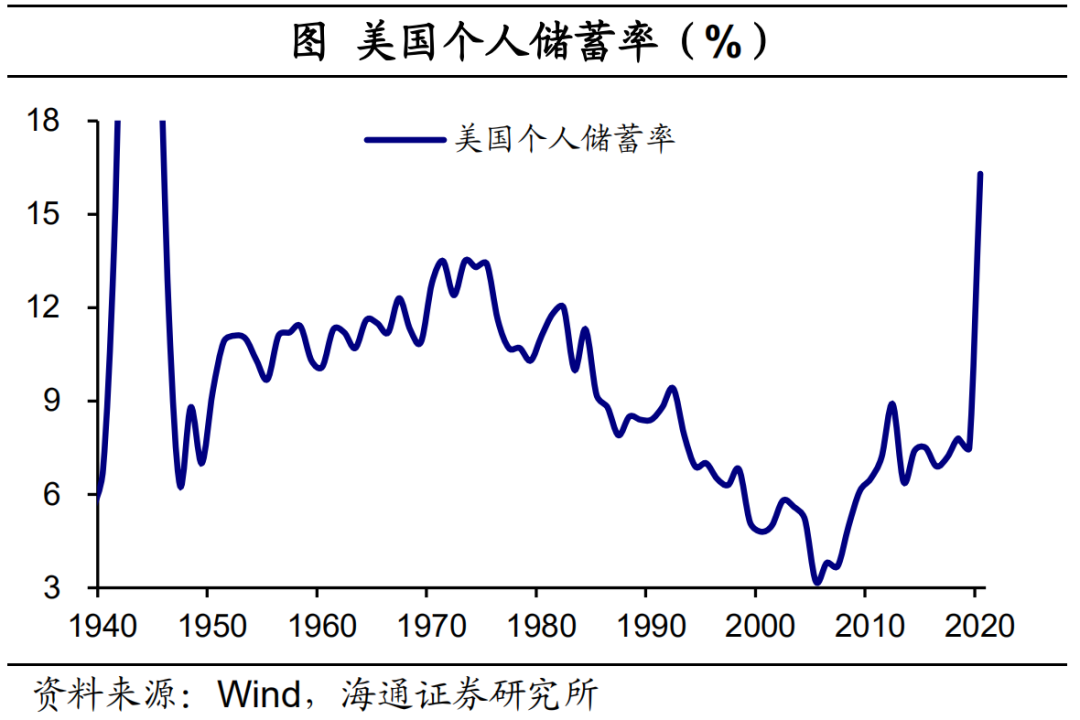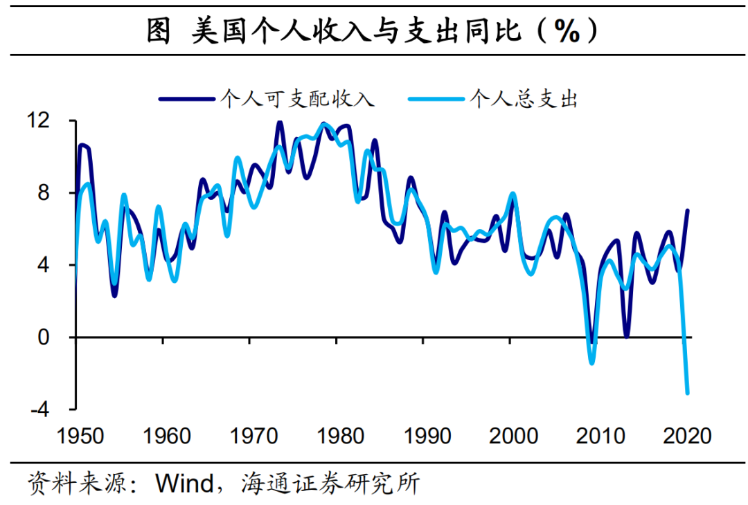 去年不仅美国居民的财富是大幅增值的,收入也是大幅提升的。以往经济衰退时,失业增加,美国居民可支配收入增速会明显下滑。例如07年次贷危机爆发后,美国居民收入增速大幅下降,直到2011-2012年增速才回到5%左右的增长。但是去年新冠疫情冲击经济,美国居民收入增速不仅没有下降,反而从2019年的3.7%提高到了2020年的7.0%,是2007年之后的最高增速。