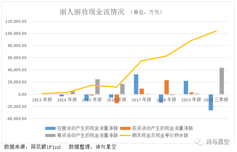 上市前的三年,丽人丽妆的期末现金余额突然有了质的飞跃,看似充足的现金余额其实另有来源。