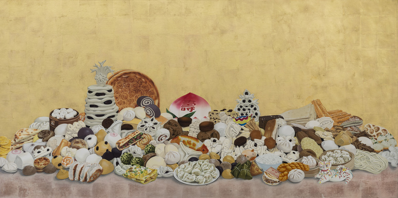 这一系列静物画近似17世纪的荷兰静物画——充斥着画面的花卉、水果、餐食、猎物和其他奇巧珍宝彰显着一个正在崛起的富裕阶级的身份——但它们又因引入了中国本土语境而增添了一丝幽默色彩和质朴精神,并与西方绘画传统乃至整个西方文明形成某种对话。在《主食》(2019)中,陈飞描绘了来自中国大江南北的各地面点。在谈到这件作品时他说,“我觉得粮食是一个很好的进入方式,中国疆域之大,从南到北,至东到西有非常丰富的饮食文化,针对粮食的加工有各种不同的处理方式,主食不同的制作方式和面点的造型也代表着不同的文化习俗和地理面貌。而主食不仅是我们主要的能量摄取来源,我觉得它还象征着安全和保障,饮食文化对于中国人来说不单单是吃这么简单,还赋予它更多的情感寄托。”
