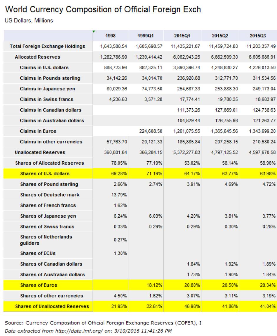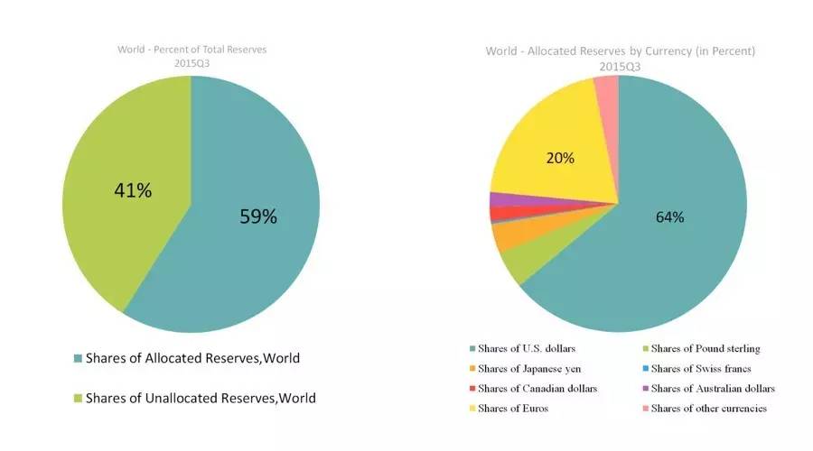 然而,这只是美元霸权地位被削弱的一个方面,根据国际货币基金组织2015年的外汇储备数据显示,上述的百分比例仅仅是已作分配的国际外汇储备中,美元与欧元各自的份额。另外有约合4万6千亿美金,占据41.04%国际外汇储备的金额没有算入其中。